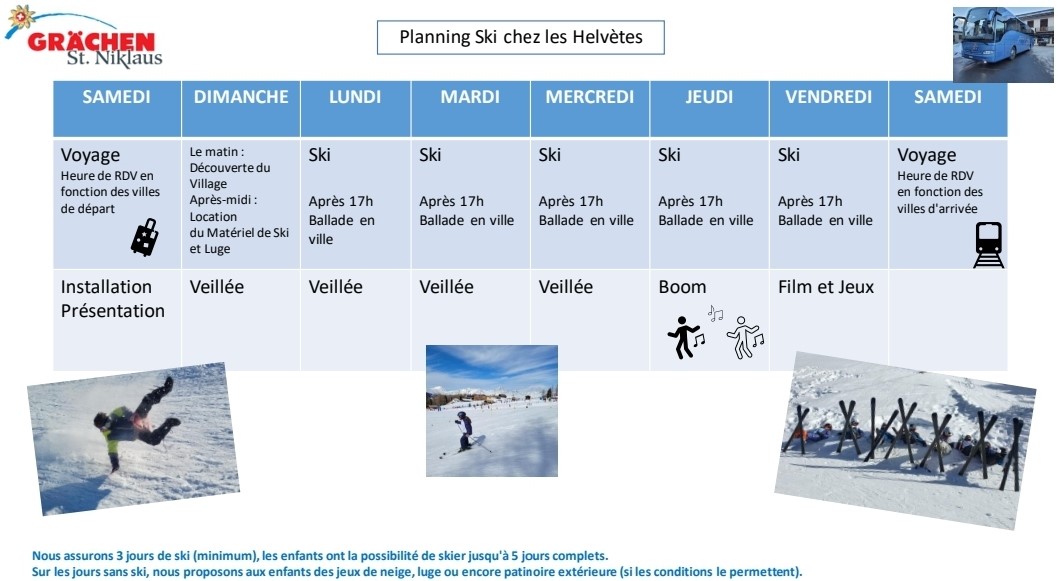 Environnement : - Selon le nombre de participants, l'hébergement se fera soit à l'Hôtel Sonne (le plus souvent les plus jeunes résident à Sonne), soit la Pension Ausblick. Formalités obligatoires: - Document d'inscription accessible une fois la réservation passée sur Totemia. - Carnet de vaccination à jour des rappels DT Polio (obligatoire) - Attestation CMU (si concerné) - Attestation de sécurité sociale (valide durant les dates du séjour) - Attestation de mutuelle (valide durant les dates du séjour) - Autorisation de sortie de territoire + copie de la pièce d'identité du parent signataire - Pièce d'identité en cours de validité de l'enfant Autres informations : - Le trousseau vous sera fourni en même temps que le carnet de voyage, par mail - Nous donnons accès aux parents à un blog pour suivre les activités et quelques photos - L'argent de poche, ainsi que les objets de valeurs de la responsabilité de chacun. - Les téléphones portables des enfants de moins de 14 ans sont conservés par les encadrants (restitués sur un temps donné pour avoir des nouvelles de ses parents)
